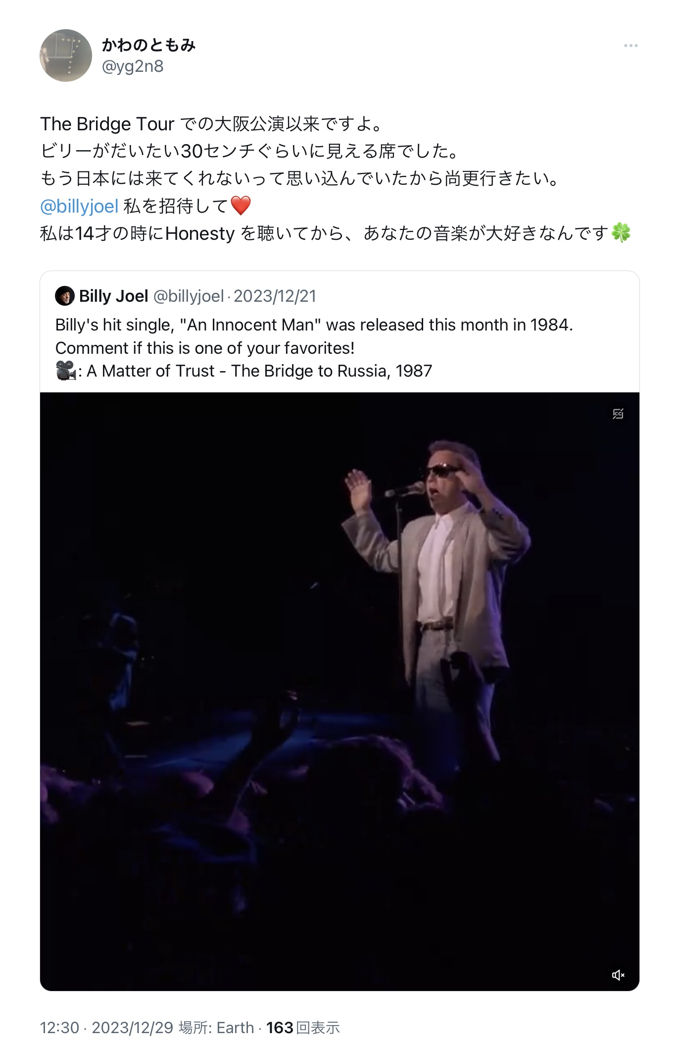 2024年公演に行けなかった大勢のファンのために、ワンナイトでも良いから、来日公演を再び実現させてくれないだろうかと願う。長生きしてね、ビリー。あとがき。